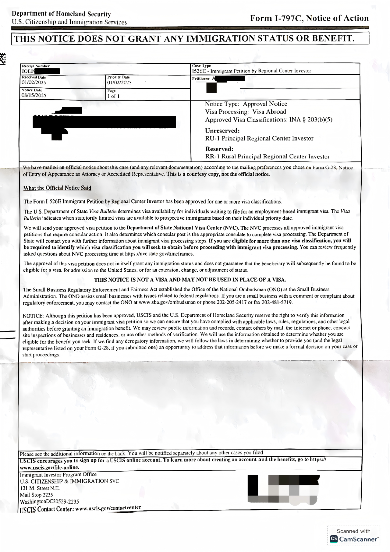 2025年08月15日:正式收到I-526E获批通知。