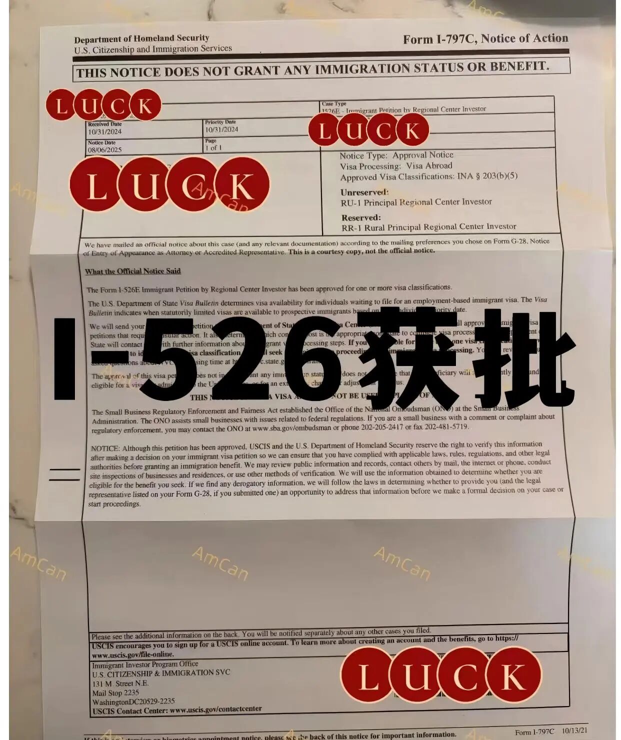 2024年10月,向美国移民局递交I-526E申请。