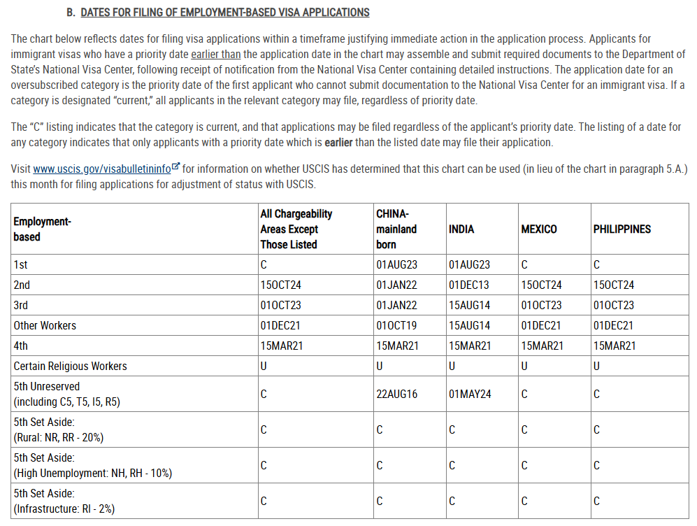• 表B(递交申请日): 这是一个“黄灯”或者说“预备跑”。主要是给人在美国的申请人用的。如果你的日期早于表B,你虽然还拿不到卡,但可以先交I-485表格(转身份申请)了。